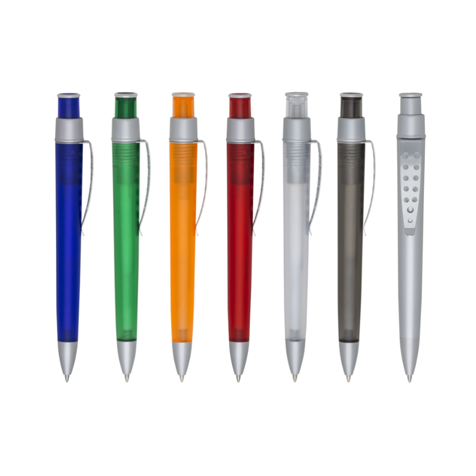 Descrição: Caneta plástica com clip metálico vazado, carga esferográfica azul 1.0mm e acionamento por clique.