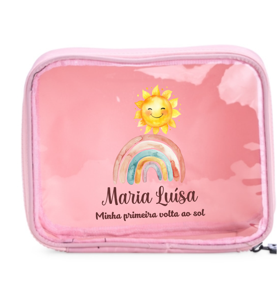Descrição: Nécessaire compacto em nylon com viseira em plástico transparente, fechamento em zíper e alça presa ao puxador.